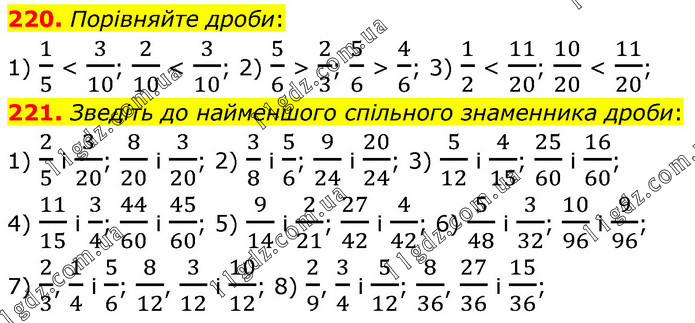 220. Порівняйте дроби: 1) 1/5 < 3/10; 2/10 < 3/10; 2) 5/6 > 2/3; 5/6 > 4/6; 3) 1/2 < 11/20; 10/20 < 11/20; 221. Зведіть до найменшого спільного знаменника дроби: 1) 2/5 і 3/20; 8/20 і 3/20; 2) 3/8 і 5/6; 9/24 і 20/24; 3) 5/12 і 4/15; 25/60 і 16/60; 4) 11/15 і 3/4; 44/60 і 45/60; 5) 9/14 і 2/21; 27/42 і 4/42; 6) 5/48 і 3/32; 10/96 і 9/96; 7) 2/3, 1/4 і 5/6; 8/12, 3/12 і 10/12; 8) 2/9, 3/4 і 5/12; 8/36, 27/36 і 15/36;