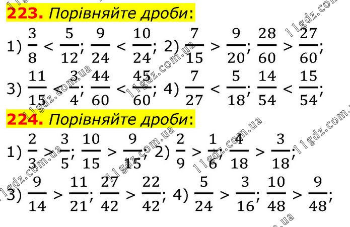 223. Порівняйте дроби: 1) 3/8 < 5/12; 9/24 < 10/24; 2) 7/15 > 9/20; 28/60 > 27/60; 3) 11/15 < 3/4; 44/60 < 45/60; 4) 7/27 < 5/18; 14/54 < 15/54; 224. Порівняйте дроби: 1) 2/3 > 3/5; 10/15 > 9/15; 2) 2/9 > 1/6; 4/18 > 3/18; 3) 9/14 > 11/21; 27/42 > 22/42; 4) 5/24 > 3/16; 10/48 > 9/48;