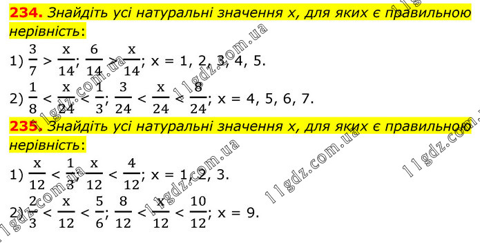 234. Знайдіть усі натуральні значення х, для яких є правильною нерівність: 1) 3/7 > x/14; 6/14 > x/14; x = 1, 2, 3, 4, 5. 2) 1/8 < x/24 < 1/3; 3/24 < x/24 < 8/24; x = 4, 5, 6, 7. 235. Знайдіть усі натуральні значення х, для яких є правильною нерівність: 1) x/12 < 1/3; x/12 < 4/12; x = 1, 2, 3. 2) 2/3 < x/12 < 5/6; 8/12 < x/12 < 10/12; x = 9.
