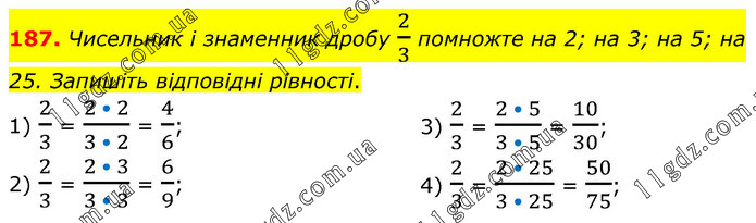 Чисельник і знаменник дробу 2/3 помножте на 2; на 3; на 5; на 25. Запишіть відповідні рівності. 1) 2/3 = (2 • 2)/(3 • 2) = 4/6; 2) 2/3 = (2 • 3)/(3 • 3) = 6/9; 3) 2/3 = (2 • 5)/(3 • 5) = 10/30; 4) 2/3 = (2 • 25)/(3 • 25) = 50/75;