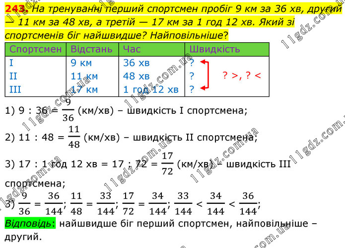 На тренуванні перший спортсмен пробіг 9 км за 36 хв, другий — 11 км за 48 хв, а третій — 17 км за 1 год 12 хв. Який зі спортсменів біг найшвидше? Найповільніше? 1) 9 : 36 = 9/36 (км/хв) – швидкість І спортсмена; 2) 11 : 48 = 11/48 (км/хв) – швидкість ІІ спортсмена; 3) 17 : 1 год 12 хв = 17 : 72 = 17/72 (км/хв) – швидкість ІІІ спортсмена; 3) 9/36 = 36/144; 11/48 = 33/144; 17/72 = 34/144; 33/144 < 34/144 < 36/144; Відповідь: найшвидше біг перший спортсмен, найповільніше – другий.