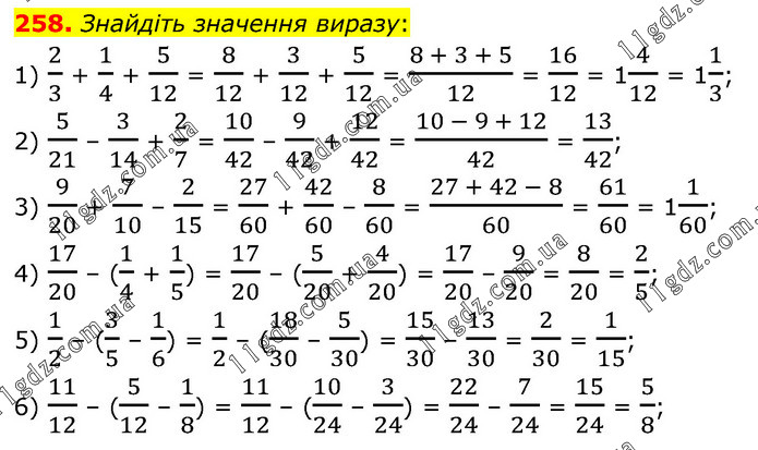 § 2. Додавання і віднімання звичайних дробів » 258
