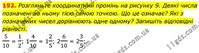 Розгляньте координатний промінь на рисунку 9. Деякі числа позначені на ньому тією самою точкою. Що це означає? Які з позначених чисел дорівнюють одне одному? Запишіть відповідні рівності. 5/10 = 1/2; 14/10 = 12/5; 26/10 = 23/5;
