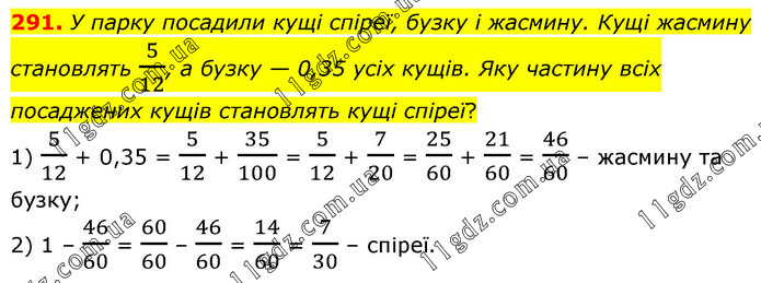 У парку посадили кущі спіреї, бузку і жасмину. Кущі жасмину становлять 5/12, а бузку — 0,35 усіх кущів. Яку частину всіх посаджених кущів становлять кущі спіреї? 1) 5/12 + 0,35 = 5/12 + 35/100 = 5/12 + 7/20 = 25/60 + 21/60 = 46/60 – жасмину та бузку; 2) 1 – 46/60 = 60/60 – 46/60 = 14/60 = 7/30 – спіреї.