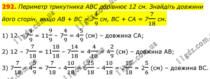 Периметр трикутника ABC дорівнює 12 см. Знайдіть довжини його сторін, якщо AB + BC = 74/9 см, BC + CA = 77/18 см. 1) 12 – 74/9 = 119/9 – 74/9 = 45/9 (см) – довжина СА; 2) 12 – 77/18 = 1118/18 – 714/18 = 44/18 = 42/9 (см) – довжина АВ; 3) 77/18 – 45/9 = 77/18 – 410/18 = 625/18 – 410/18 = 215/18 = 25/6 (см) – довжина ВС.