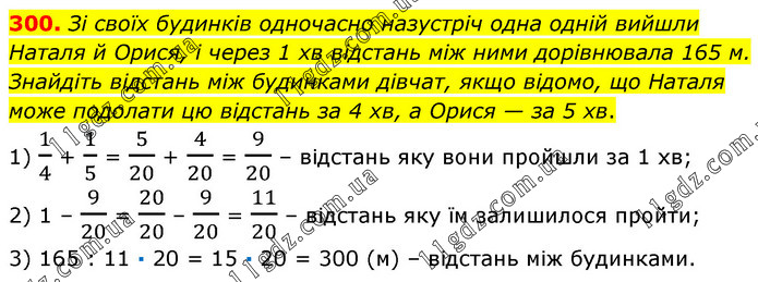 Зі своїх будинків одночасно назустріч одна одній вийшли Наталя й Орися, і через 1 хв відстань між ними дорівнювала 165 м. Знайдіть відстань між будинками дівчат, якщо відомо, що Наталя може подолати цю відстань за 4 хв, а Орися — за 5 хв. 1) 1/4 + 1/5 = 5/20 + 4/20 = 9/20 – відстань яку вони пройшли за 1 хв; 2) 1 – 9/20 = 20/20 – 9/20 = 11/20 – відстань яку їм залишилося пройти; 3) 165 : 11 · 20 = 15 · 20 = 300 (м) – відстань між будинками.