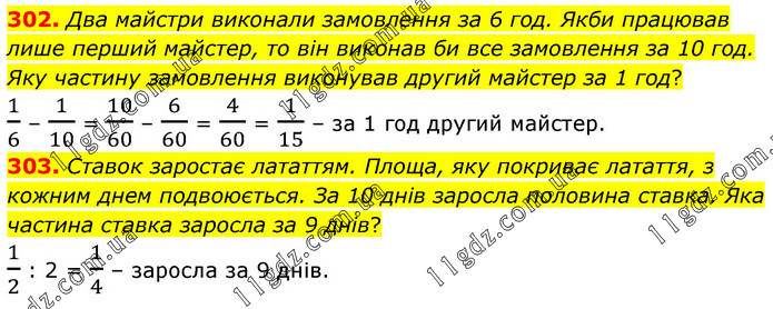 302. Два майстри виконали замовлення за 6 год. Якби працював лише перший майстер, то він виконав би все замовлення за 10 год. Яку частину замовлення виконував другий майстер за 1 год? 1/6 – 1/10 = 10/60 – 6/60 = 4/60 = 1/15 – за 1 год другий майстер. 303. Ставок заростає лататтям. Площа, яку покриває латаття, з кожним днем подвоюється. За 10 днів заросла половина ставка. Яка частина ставка заросла за 9 днів? 1/2 : 2 = 1/4 – заросла за 9 днів.