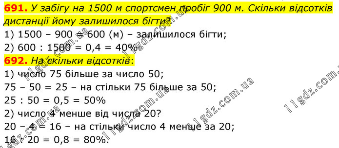 691. У забігу на 1500 м спортсмен пробіг 900 м. Скільки відсотків дистанції йому залишилося бігти? 1) 1500 – 900 = 600 (м) – залишилося бігти; 2) 600 : 1500 = 0,4 = 40% 692. На скільки відсотків: 1) число 75 більше за число 50; 75 – 50 = 25 – на стільки 75 більше за 50; 25 : 50 = 0,5 = 50% 2) число 4 менше від числа 20? 20 – 4 = 16 – на стільки число 4 менше за 20; 16 : 20 = 0,8 = 80%.