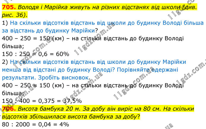 705. Володя і Марійка живуть на різних відстанях від школи (див. рис. 36). 1) На скільки відсотків відстань від школи до будинку Володі більша за відстань до будинку Марійки? 400 – 250 = 150 (км) – на стільки відстань до будинку Володі більша; 150 : 250 = 0,6 = 60% 2) На скільки відсотків відстань від школи до будинку Марійки менша від відстані до будинку Володі? Порівняйте одержані результати. Зробіть висновок. 400 – 250 = 150 (км) – на стільки відстань до будинку Володі більша; 150 : 400 = 0,375 = 37,5% 706. Висота бамбука 20 м. За добу він виріс на 80 см. На скільки відсотків збільшилася висота бамбука за добу? 80 : 2000 = 0,04 = 4%
