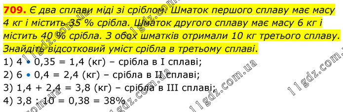 Є два сплави міді зі сріблом. Шматок першого сплаву має масу 4 кг і містить 35 % срібла. Шматок другого сплаву має масу 6 кг і містить 40 % срібла. З обох шматків отримали 10 кг третього сплаву. Знайдіть відсотковий уміст срібла в третьому сплаві. 1) 4 • 0,35 = 1,4 (кг) – срібла в І сплаві; 2) 6 • 0,4 = 2,4 (кг) – срібла в ІІ сплаві; 3) 1,4 + 2,4 = 3,8 (кг) – срібла в ІІІ сплаві; 4) 3,8 : 10 = 0,38 = 38%