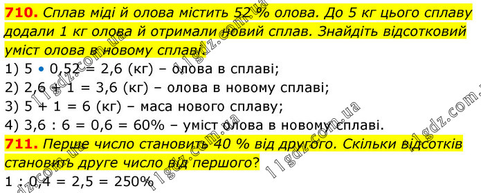 710. Сплав міді й олова містить 52 % олова. До 5 кг цього сплаву додали 1 кг олова й отримали новий сплав. Знайдіть відсотковий уміст олова в новому сплаві. 1) 5 • 0,52 = 2,6 (кг) – олова в сплаві; 2) 2,6 + 1 = 3,6 (кг) – олова в новому сплаві; 3) 5 + 1 = 6 (кг) – маса нового сплаву; 4) 3,6 : 6 = 0,6 = 60% – уміст олова в новому сплаві. 711. Перше число становить 40 % від другого. Скільки відсотків становить друге число від першого? 1 : 0,4 = 2,5 = 250%