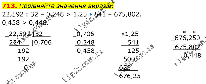 Порівняйте значення виразів: 22,592 : 32 – 0,248 > 1,25 • 541 – 675,802. 0,458 > 0,448.