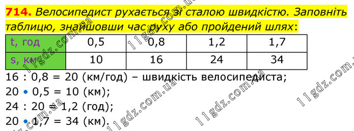 Велосипедист рухається зі сталою швидкістю. Заповніть таблицю, знайшовши час руху або пройдений шлях: t, год 0,5 0,8 1,2 1,7 s, км 10 16 24 34 16 : 0,8 = 20 (км/год) – швидкість велосипедиста; 20 • 0,5 = 10 (км); 24 : 20 = 1,2 (год); 20 • 1,7 = 34 (км).