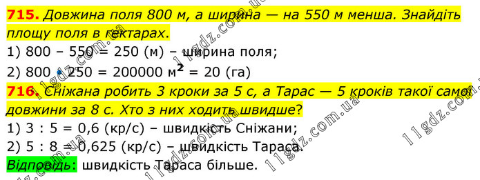 715. Довжина поля 800 м, а ширина — на 550 м менша. Знайдіть площу поля в гектарах. 1) 800 – 550 = 250 (м) – ширина поля; 2) 800 • 250 = 200000 м2 = 20 (га) 716. Сніжана робить 3 кроки за 5 с, а Тарас — 5 кроків такої самої довжини за 8 с. Хто з них ходить швидше? 1) 3 : 5 = 0,6 (кр/с) – швидкість Сніжани; 2) 5 : 8 = 0,625 (кр/с) – швидкість Тараса. Відповідь: швидкість Тараса більше.