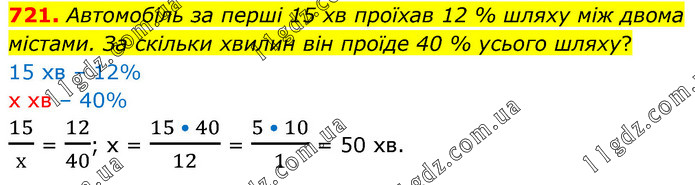 Автомобіль за перші 15 хв проїхав 12 % шляху між двома містами. За скільки хвилин він проїде 40 % усього шляху? 15 хв – 12% х хв – 40% 15/х = 12/40; х = (15 • 40)/12 = (5 • 10)/1 = 50 хв.