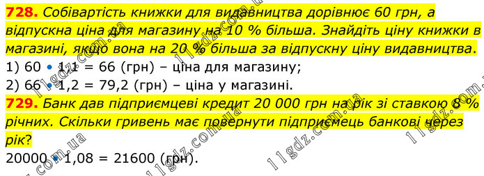 728. Собівартість книжки для видавництва дорівнює 60 грн, а відпускна ціна для магазину на 10 % більша. Знайдіть ціну книжки в магазині, якщо вона на 20 % більша за відпускну ціну видавництва. 1) 60 • 1,1 = 66 (грн) – ціна для магазину; 2) 66 • 1,2 = 79,2 (грн) – ціна у магазині. 729. Банк дав підприємцеві кредит 20 000 грн на рік зі ставкою 8 % річних. Скільки гривень має повернути підприємець банкові через рік? 20000 • 1,08 = 21600 (грн).