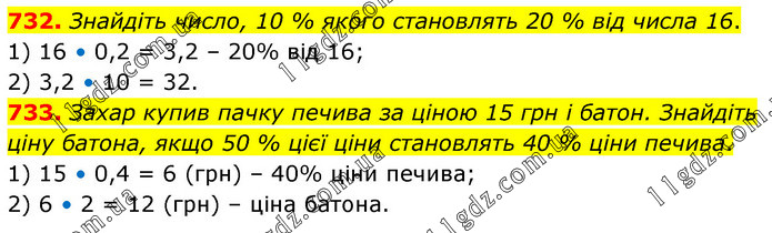 732. Знайдіть число, 10 % якого становлять 20 % від числа 16. 1) 16 • 0,2 = 3,2 – 20% від 16; 2) 3,2 • 10 = 32. 733. Захар купив пачку печива за ціною 15 грн і батон. Знайдіть ціну батона, якщо 50 % цієї ціни становлять 40 % ціни печива. 1) 15 • 0,4 = 6 (грн) – 40% ціни печива; 2) 6 • 2 = 12 (грн) – ціна батона.
