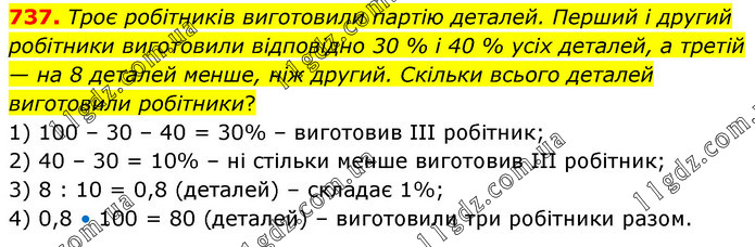 Троє робітників виготовили партію деталей. Перший і другий робітники виготовили відповідно 30 % і 40 % усіх деталей, а третій — на 8 деталей менше, ніж другий. Скільки всього деталей виготовили робітники? 1) 100 – 30 – 40 = 30% – виготовив ІІІ робітник; 2) 40 – 30 = 10% – ні стільки менше виготовив ІІІ робітник; 3) 8 : 10 = 0,8 (деталей) – складає 1%; 4) 0,8 • 100 = 80 (деталей) – виготовили три робітники разом.