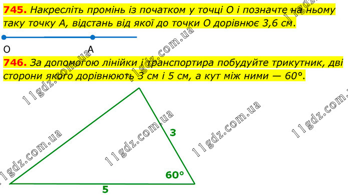 745. Накресліть промінь із початком у точці O і позначте на ньому таку точку А, відстань від якої до точки O дорівнює 3,6 см. О А 746. За допомогою лінійки і транспортира побудуйте трикутник, дві сторони якого дорівнюють 3 см і 5 см, а кут між ними — 60°.