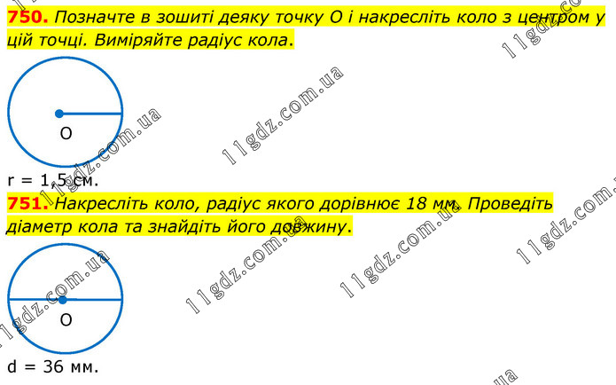 750. Позначте в зошиті деяку точку O і накресліть коло з центром у цій точці. Виміряйте радіус кола. r = 1,5 см. 751. Накресліть коло, радіус якого дорівнює 18 мм. Проведіть діаметр кола та знайдіть його довжину. d = 36 мм.