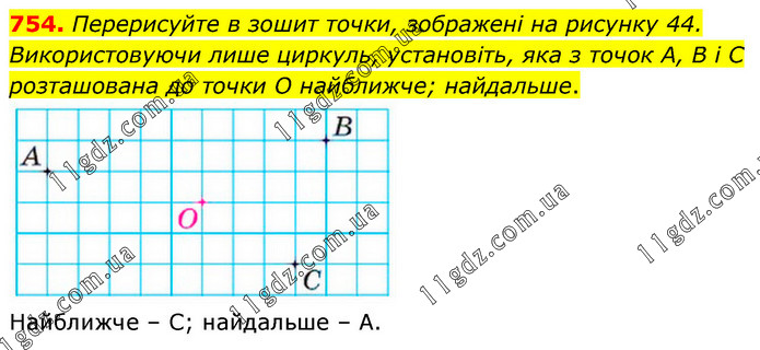 Перерисуйте в зошит точки, зображені на рисунку 44. Використовуючи лише циркуль, установіть, яка з точок А, B i C розташована до точки O найближче; найдальше. Найближче – С; найдальше – А.