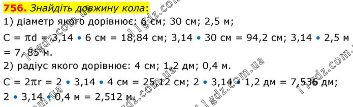 Знайдіть довжину кола: 1) діаметр якого дорівнює: 6 см; 30 см; 2,5 м; С = d = 3,14 • 6 см = 18,84 см; 3,14 • 30 см = 94,2 см; 3,14 • 2,5 м = 7, 85 м. 2) радіус якого дорівнює: 4 см; 1,2 дм; 0,4 м. С = 2r = 2 • 3,14 • 4 см = 25,12 см; 2 • 3,14 • 1,2 дм = 7,536 дм; 2 • 3,14 • 0,4 м = 2,512 м.