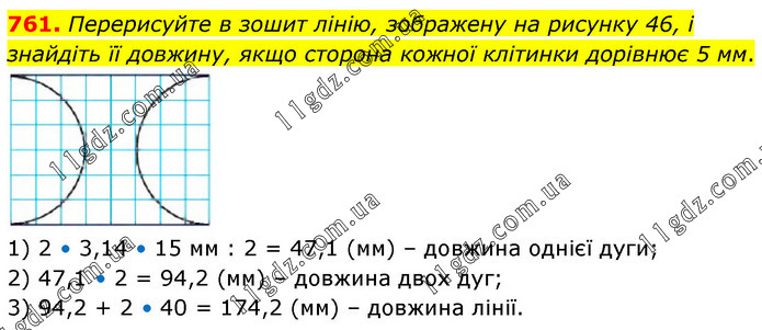Перерисуйте в зошит лінію, зображену на рисунку 46, і знайдіть її довжину, якщо сторона кожної клітинки дорівнює 5 мм. 1) 2 • 3,14 • 15 мм : 2 = 47,1 (мм) – довжина однієї дуги; 2) 47,1 • 2 = 94,2 (мм) – довжина двох дуг; 3) 94,2 + 2 • 40 = 174,2 (мм) – довжина лінії.