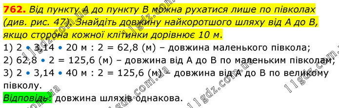 Від пункту А до пункту В можна рухатися лише по півколах (див. рис. 47). Знайдіть довжину найкоротшого шляху від А до В, якщо сторона кожної клітинки дорівнює 10 м. 1) 2 • 3,14 • 20 м : 2 = 62,8 (м) – довжина маленького півкола; 2) 62,8 • 2 = 125,6 (м) – довжина від А до В по маленьким півколам; 3) 2 • 3,14 • 40 м : 2 = 125,6 (м) – довжина від А до В по великому півколу. Відповідь: довжина шляхів однакова.