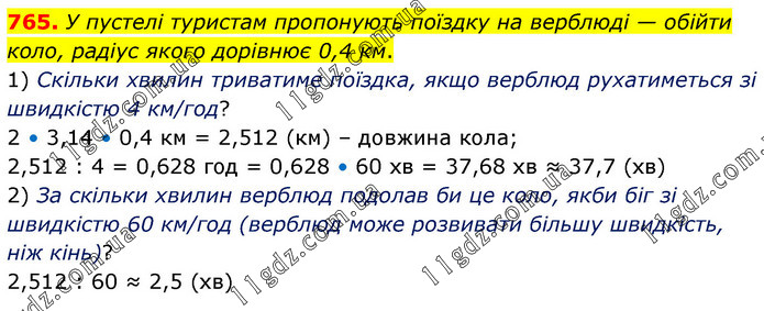 У пустелі туристам пропонують поїздку на верблюді — обійти коло, радіус якого дорівнює 0,4 км. 1) Скільки хвилин триватиме поїздка, якщо верблюд рухатиметься зі швидкістю 4 км/год? 2 • 3,14 • 0,4 км = 2,512 (км) – довжина кола; 2,512 : 4 = 0,628 год = 0,628 • 60 хв = 37,68 хв ≈ 37,7 (хв) 2) За скільки хвилин верблюд подолав би це коло, якби біг зі швидкістю 60 км/год (верблюд може розвивати більшу швидкість, ніж кінь)? 2,512 : 60 ≈ 2,5 (хв)