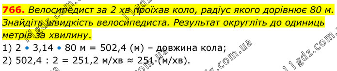 Велосипедист за 2 хв проїхав коло, радіус якого дорівнює 80 м. Знайдіть швидкість велосипедиста. Результат округліть до одиниць метрів за хвилину. 1) 2 • 3,14 • 80 м = 502,4 (м) – довжина кола; 2) 502,4 : 2 = 251,2 м/хв ≈ 251 (м/хв).