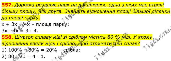 557. Доріжка розділяє парк на дві ділянки, одна з яких має втричі більшу площу, ніж друга. Знайдіть відношення площі більшої ділянки до площі парку. х + 3х = 4х – площа парку; 3х : 4х = 3 : 4. 558. Шматок сплаву міді зі сріблом містить 80 % міді. У якому відношенні взяли мідь і срібло, щоб отримати цей сплав? 1) 100% – 80% = 20% – срібла; 2) 80 : 20 = 4 : 1.