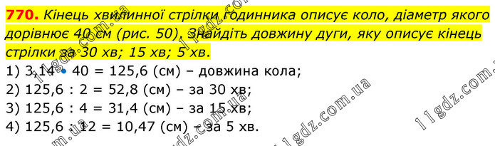 Кінець хвилинної стрілки годинника описує коло, діаметр якого дорівнює 40 см (рис. 50). Знайдіть довжину дуги, яку описує кінець стрілки за 30 хв; 15 хв; 5 хв. 1) 3,14 • 40 = 125,6 (см) – довжина кола; 2) 125,6 : 2 = 52,8 (см) – за 30 хв; 3) 125,6 : 4 = 31,4 (см) – за 15 хв; 4) 125,6 : 12 = 10,47 (см) – за 5 хв.