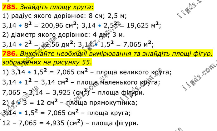 785. Знайдіть площу круга: 1) радіус якого дорівнює: 8 см; 2,5 м; 3,14 • 82 = 200,96 см2; 3,14 • 2,52 = 19,625 м2; 2) діаметр якого дорівнює: 4 дм; 3 м. 3,14 • 22 = 12,56 дм2; 3,14 • 1,52 = 7,065 м2; 786. Виконайте необхідні вимірювання та знайдіть площі фігур, зображених на рисунку 55. 1) 3,14 • 1,52 = 7,065 см2 – площа великого круга; 3,14 • 12 = 3,14 см2 – площа маленького круга; 7,065 – 3,14 = 3,925 (см2) – площа фігури. 2) 4 • 3 = 12 см2 – площа прямокутника; 3,14 • 1,52 = 7,065 см2 – площа круга; 12 – 7,065 = 4,935 (см2) – площа фігури.