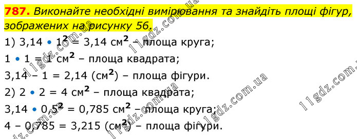 Виконайте необхідні вимірювання та знайдіть площі фігур, зображених на рисунку 56. 1) 3,14 • 12 = 3,14 см2 – площа круга; 1 • 1 = 1 см2 – площа квадрата; 3,14 – 1 = 2,14 (см2) – площа фігури. 2) 2 • 2 = 4 см2 – площа квадрата; 3,14 • 0,52 = 0,785 см2 – площа круга; 4 – 0,785 = 3,215 (см2) – площа фігури.