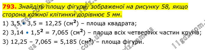 Знайдіть площу фігури, зображеної на рисунку 58, якщо сторона кожної клітинки дорівнює 5 мм. 1) 3,5 • 3,5 = 12,25 (см2) – площа квадрата; 2) 3,14 • 1,52 = 7,065 (см2) – площа всіх четвертих частин кругів; 3) 12,25 – 7,065 = 5,185 (см2) – площа фігури.