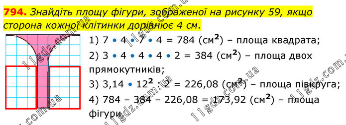 Знайдіть площу фігури, зображеної на рисунку 59, якщо сторона кожної клітинки дорівнює 4 см. 1) 7 • 4 • 7 • 4 = 784 (см2) – площа квадрата; 2) 3 • 4 • 4 • 4 • 2 = 384 (см2) – площа двох прямокутників; 3) 3,14 • 122 : 2 = 226,08 (см2) – площа півкруга; 4) 784 – 384 – 226,08 = 173,92 (см2) – площа фігури.
