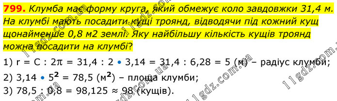 Клумба має форму круга, який обмежує коло завдовжки 31,4 м. На клумбі мають посадити кущі троянд, відводячи під кожний кущ щонайменше 0,8 м2 землі. Яку найбільшу кількість кущів троянд можна посадити на клумбі? 1) r = C : 2 = 31,4 : 2 • 3,14 = 31,4 : 6,28 = 5 (м) – радіус клумби; 2) 3,14 • 52 = 78,5 (м2) – площа клумби; 3) 78,5 : 0,8 = 98,125 ≈ 98 (кущів).
