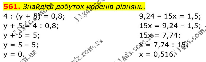 Знайдіть добуток коренів рівнянь. 4 : (у + 5) = 0,8; у + 5 = 4 : 0,8; у + 5 = 5; у = 5 – 5; у = 0. 9,24 – 15х = 1,5; 15х = 9,24 – 1,5; 15х = 7,74; х = 7,74 : 15; х = 0,516.