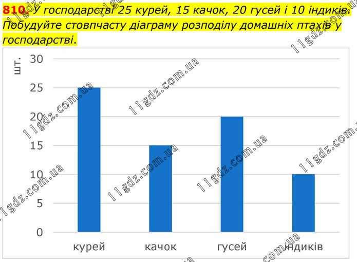 У господарстві 25 курей, 15 качок, 20 гусей і 10 індиків. Побудуйте стовпчасту діаграму розподілу домашніх птахів у господарстві.