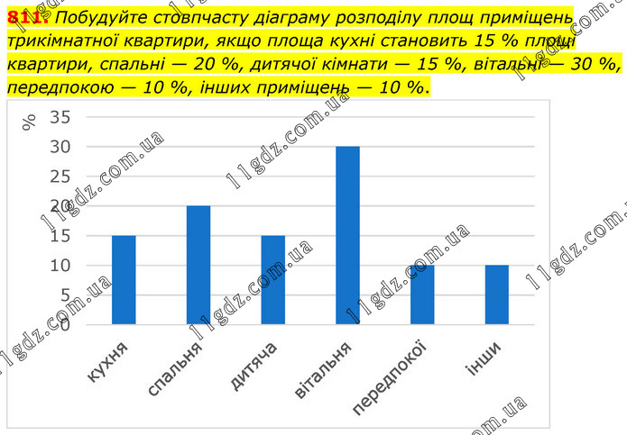 Побудуйте стовпчасту діаграму розподілу площ приміщень трикімнатної квартири, якщо площа кухні становить 15 % площі квартири, спальні — 20 %, дитячої кімнати — 15 %, вітальні — 30 %, передпокою — 10 %, інших приміщень — 10 %.
