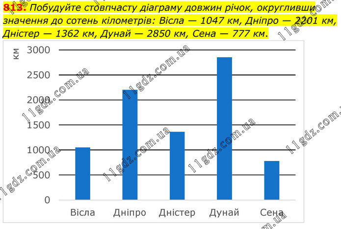 Побудуйте стовпчасту діаграму довжин річок, округливши значення до сотень кілометрів: Вісла — 1047 км, Дніпро — 2201 км, Дністер — 1362 км, Дунай — 2850 км, Сена — 777 км.