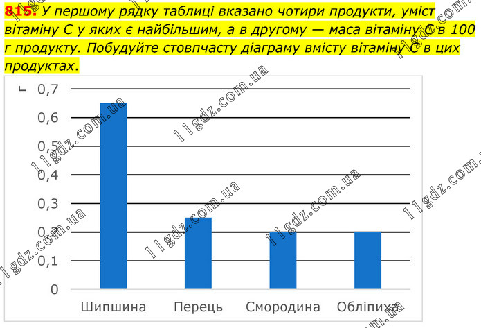 У першому рядку таблиці вказано чотири продукти, уміст вітаміну C у яких є найбільшим, а в другому — маса вітаміну C в 100 г продукту. Побудуйте стовпчасту діаграму вмісту вітаміну C в цих продуктах.