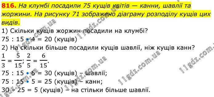 На клумбі посадили 75 кущів квітів — канни, шавлії та жоржини. На рисунку 71 зображено діаграму розподілу кущів цих видів. 1) Скільки кущів жоржин посадили на клумбі? 75 : 15 • 4 = 20 (кущів) 2) На скільки більше посадили кущів шавлії, ніж кущів канн? 1/3 = 5/15; 2/5 = 6/15. 75 : 15 • 6 = 30 (кущів) – шавлії; 75 : 15 • 5 = 25 (кущів) – канн; 30 – 25 = 5 (кущів) – на стільки більше шавлії.