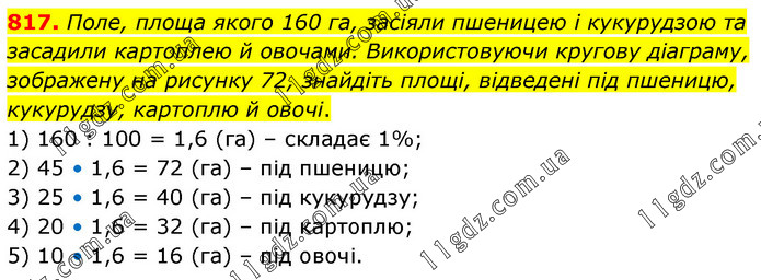 Поле, площа якого 160 га, засіяли пшеницею і кукурудзою та засадили картоплею й овочами. Використовуючи кругову діаграму, зображену на рисунку 72, знайдіть площі, відведені під пшеницю, кукурудзу, картоплю й овочі. 1) 160 : 100 = 1,6 (га) – складає 1%; 2) 45 • 1,6 = 72 (га) – під пшеницю; 3) 25 • 1,6 = 40 (га) – під кукурудзу; 4) 20 • 1,6 = 32 (га) – під картоплю; 5) 10 • 1,6 = 16 (га) – під овочі.