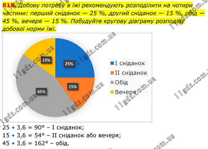 Добову потребу в їжі рекомендують розподілити на чотири частини: перший сніданок — 25 %, другий сніданок — 15 %, обід — 45 %, вечеря — 15 %. Побудуйте кругову діаграму розподілу добової норми їжі. 25 • 3,6 = 90° – І сніданок; 15 • 3,6 = 54° – ІІ сніданок або вечеря; 45 • 3,6 = 162° – обід.