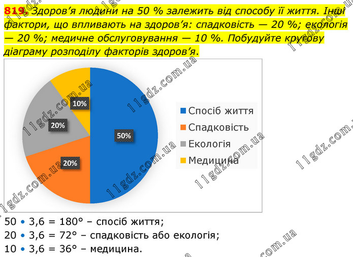 Здоров’я людини на 50 % залежить від способу її життя. Інші фактори, що впливають на здоров’я: спадковість — 20 %; екологія — 20 %; медичне обслуговування — 10 %. Побудуйте кругову діаграму розподілу факторів здоров’я. 50 • 3,6 = 180° – спосіб життя; 20 • 3,6 = 72° – спадковість або екологія; 10 • 3,6 = 36° – медицина.