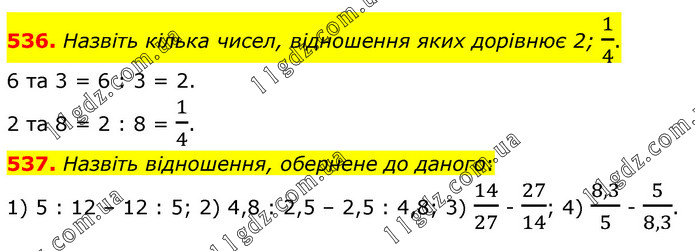 536. Назвіть кілька чисел, відношення яких дорівнює 2; 1/4. 6 та 3 = 6 : 3 = 2. 2 та 8 = 2 : 8 = 1/4. 537. Назвіть відношення, обернене до даного: 1) 5 : 12 – 12 : 5; 2) 4,8 : 2,5 – 2,5 : 4,8; 3) 14/27 - 27/14; 4) 8,3/5 - 5/8,3.