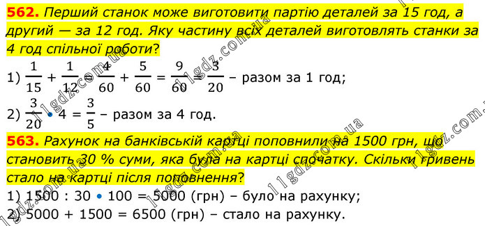 562. Перший станок може виготовити партію деталей за 15 год, а другий — за 12 год. Яку частину всіх деталей виготовлять станки за 4 год спільної роботи? 1) 1/15 + 1/12 = 4/60 + 5/60 = 9/60 = 3/20 – разом за 1 год; 2) 3/20 • 4 = 3/5 – разом за 4 год. 563. Рахунок на банківській картці поповнили на 1500 грн, що становить 30 % суми, яка була на картці спочатку. Скільки гривень стало на картці після поповнення? 1) 1500 : 30 • 100 = 5000 (грн) – було на рахунку; 2) 5000 + 1500 = 6500 (грн) – стало на рахунку.