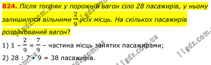 Після того як у порожній вагон сіло 28 пасажирів, у ньому залишилося вільними 2/9 усіх місць. На скількох пасажирів розрахований вагон? 1) 1 – 2/9 = 7/9 – частина місць занятих пасажирами; 2) 28 : 7 • 9 = 38 пасажирів.