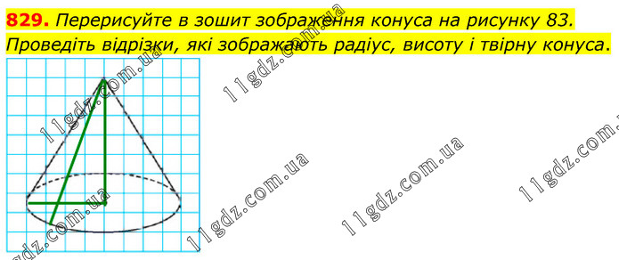 Перерисуйте в зошит зображення конуса на рисунку 83. Проведіть відрізки, які зображають радіус, висоту і твірну конуса.